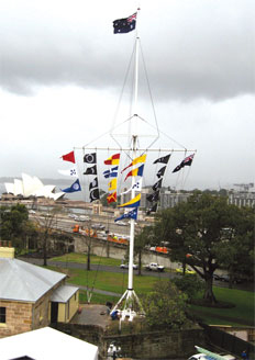 Flag display at Observatory Park. A large signal flag mast has been erected in the grounds of the Sydney Observatory on the location of the original Fort Phillip Signal Station from 19th Century. With multiple halyards, an impressive display of flags is flown daily. Noted vexillologists John Vaughan will explain the flags and raise some historical flags of Australia. Transport will be provided to/from venue and a light lunch (included in registration). Group Photo at the flag mast. |